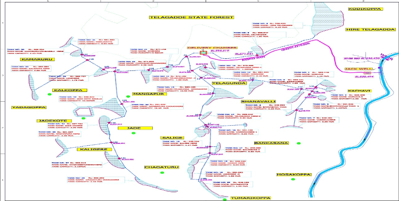 Specialization: The project site was located in Kachvi village of Soraba taluk,the water allocation of the project is 0.15 tmc. The project aim was to lift water Varada river and supply to tanks for filling for certain duration of time, which will rejuvenate the ground water source as well as provide irrigation facilities to the command area of these tanks. The water being lifted from the proposed jack well near Kachavi village, the water is lifted in one stage. The water is proposed to be lifted form Varada river near Kachavi village (RBL534.350 m, Sump level – 532.753 m) to delivery Chamber DC (R.595.519) at Telagunda village, intake trough is proposed for the length of 150m and Propose Rising main length is 4.310 Km. The water will be lifted for static head of 100 M using working 1+1 standby numbers of V.T pumps of Capacity 290 HP & will be carried through 1 row of 410 mm outer dia MS pipe rising main is proposed. From Delivery Chamber water is filled for 26 + additional tanks through Gravity pipe lines of length 23.022 km.